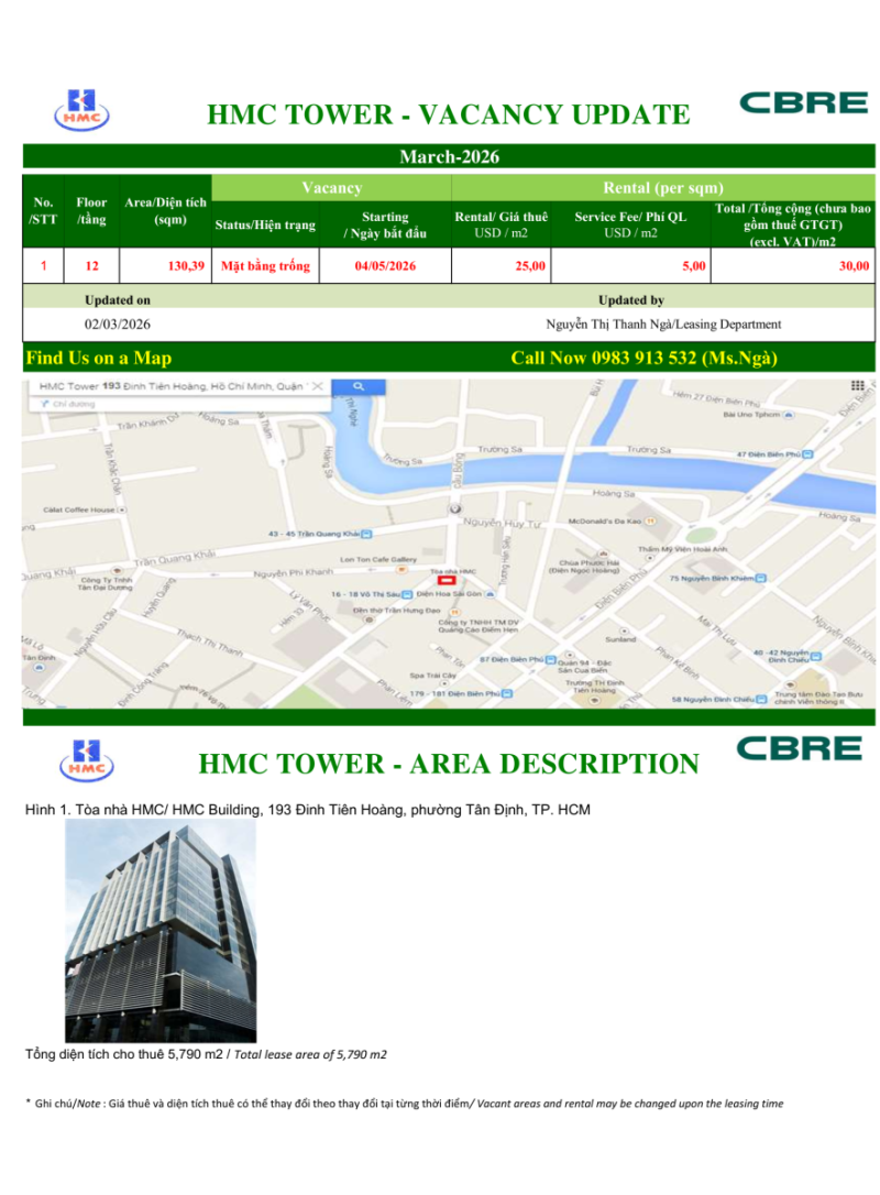 HMC Tower - BẢNG CÂP NHẬT VĂN PHÒNG TRỐNG CHO THUÊ (03/2026)